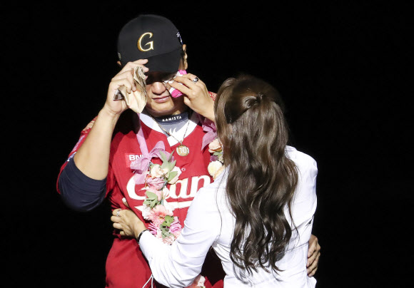 사실 오늘이 제가 3살 때 돌아가신 아버지 기일이었습니다. 기일에 은퇴식을 한다는 게 감회가 새롭고 많이 슬픈데 덕아웃에서 보는 사직야구장 관중석만큼 멋진 풍경은 아마 없을 겁니다. 또 사직야구장 타석에서 들리는 부산 팬 여러분의 함성만큼 든든하고 힘이 나는 소리도 아마 세상에 없을 겁니다.